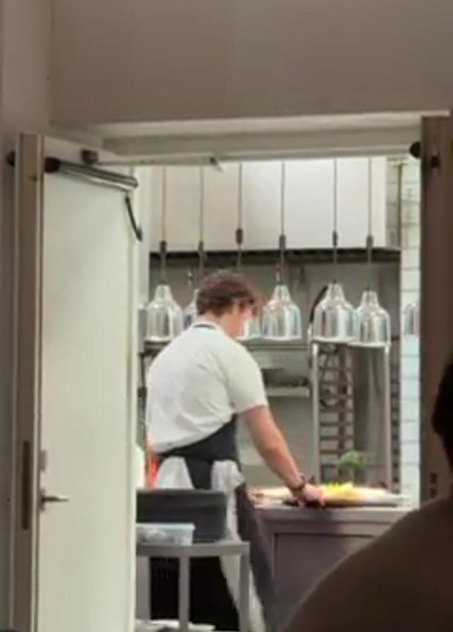 kitchen setting from the vantage point of someone sitting in a dining area. Two chefs, one male with short brown hair wearing a white chef's coat and a black apron, and a female with red hair pulled back wearing a similar uniform, are seen preparing food. The man places a platter on the counter, and the woman picks it up and exits the kitchen to presumably serve the dish. Above the counter are several hanging pendant lights. There is a stack of plates on the counter, a metal shelving unit holding various items, and a partial view of another diner in the foreground. The kitchen is visible through an open doorway with a white frame. There is ornate decoration on the ceiling in the dining area.