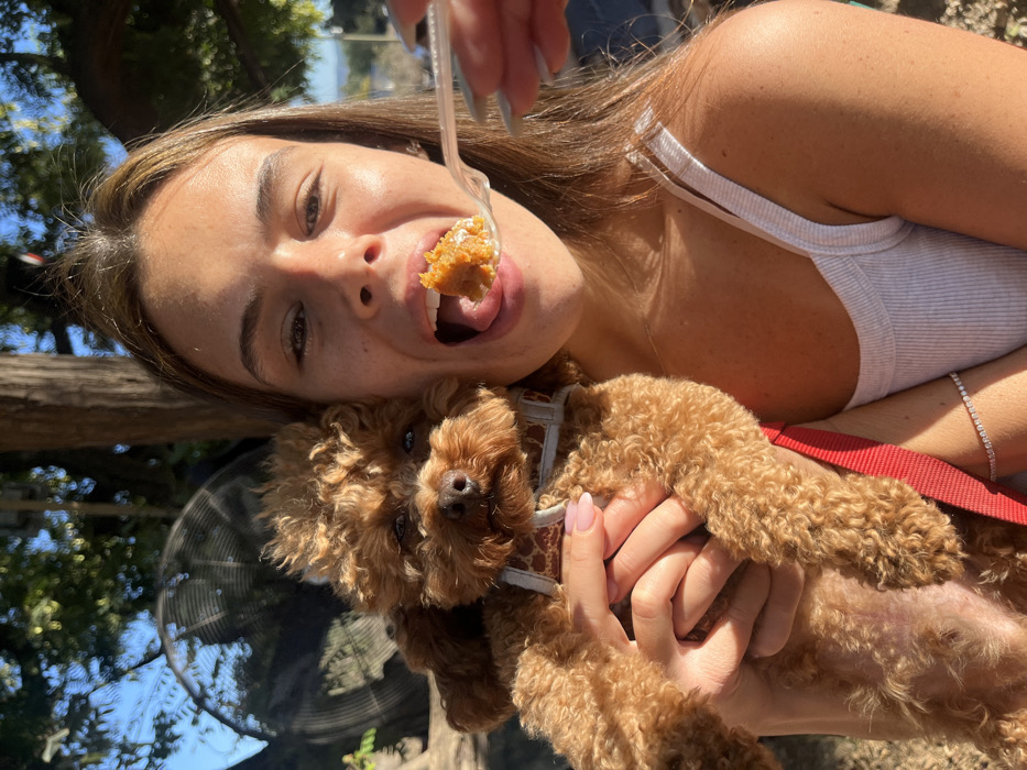The scene, located outdoors in Kfar Ruth, Israel, depicts a young adult female and a small dog. The female, with long brown hair, wears a white ribbed tank top and a thin bracelet on her left wrist. She is centrally positioned, holding a small, curly-furred brown dog, which wears a brown and white patterned harness with an attached red leash. The dog faces forward. The female's mouth is open, with her tongue extended, receiving an orange-colored substance from a clear plastic spoon. A partially visible hand, likely female and featuring light pink manicured nails, holds the spoon, entering the frame from the right. The background includes visible tree trunks, green foliage, a large industrial fan with rotating blades in the upper left, and a clear blue sky. Natural sunlight illuminates the scene.