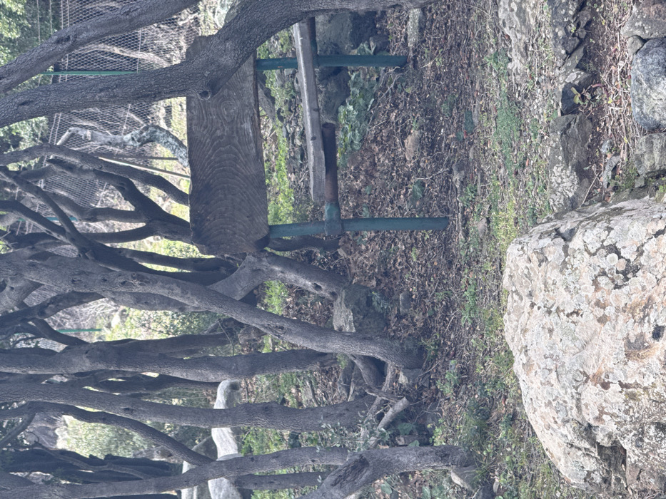 The image displays a static outdoor scene in Palaiopoli, Greece. A rustic wooden bench with a thick, rough-hewn log backrest and a simpler plank seat is centrally positioned, supported by dark green metal posts. Numerous slender, gnarled trees with bare, intertwining branches dominate the frame, suggesting a dormant season. The ground beneath is covered with fallen leaves, dirt, and sparse green vegetation. A prominent, large light-gray boulder with lichen growth occupies the lower foreground. Smaller rocks are scattered throughout the terrain. A chain-link fence is partially visible in the distant background, obscured by tree branches. No persons or active subjects are present.