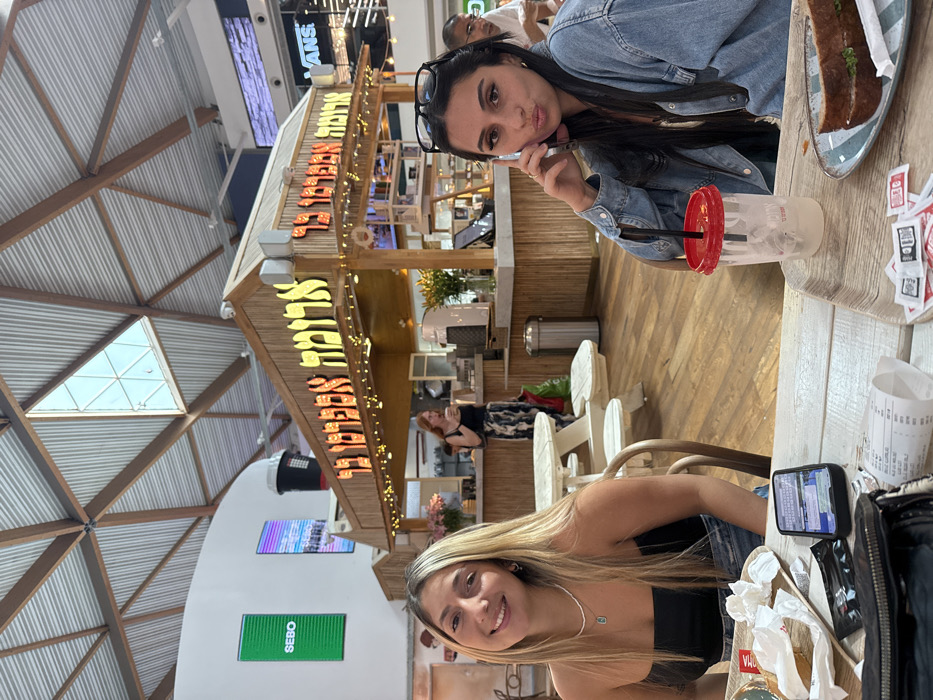 This image depicts an indoor scene at an Aroma Espresso Bar kiosk within a shopping center, identified as likely the Ice Mall in Eilat, Israel, due to the distinctive vaulted ceiling with exposed wooden beams, corrugated metal panels, and triangular skylights. In the foreground, two young adult females are seated at a light wooden table. The female on the left has long blonde hair, wears a black strapless top, and smiles directly at the camera. The female on the right has long dark hair, wears a denim jacket, has eyeglasses pushed onto her head, and holds a dark smartphone to her right ear while puckering her lips towards the camera. On the table between them are remnants of a meal, including a partially consumed sandwich on a blue-patterned plate, a clear plastic cup with a red lid and straw, a black purse, a smartphone displaying a chat application, crumpled paper napkins, a receipt, and several small condiment packets. In the mid-ground, behind the seated women, is the Aroma Espresso Bar kiosk. It features a wooden, hut-like structure with "ארומה אספרסו בר" (Aroma Espresso Bar) displayed in illuminated Hebrew lettering, adorned with string lights. A female customer with reddish-blonde hair stands at the counter, holding a cup. A silver cylindrical trash receptacle is visible beside the kiosk. The background reveals the expansive interior of the mall. The high ceiling features visible structural elements and multiple skylights. White walls display large digital screens, one prominently featuring the green "SEBO" logo, and another showing abstract colorful graphics. A "VANS" store sign is partially visible in the distance. A male individual is partially visible seated at a table to the far right. The flooring consists of light-colored wooden planks.