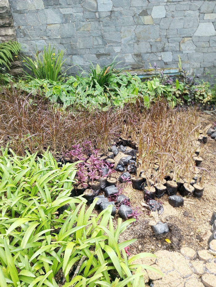 A garden bed is filled with various plants and seedlings. In the foreground, vibrant green plants with broad leaves dominate. Behind them, a mix of reddish-brown ornamental grasses and purple heart plants in black plastic bags are scattered across a mulch-covered ground. The plants are closely packed, giving a dense, layered appearance. A textured stone wall rises in the background, partially obscured by greenery.