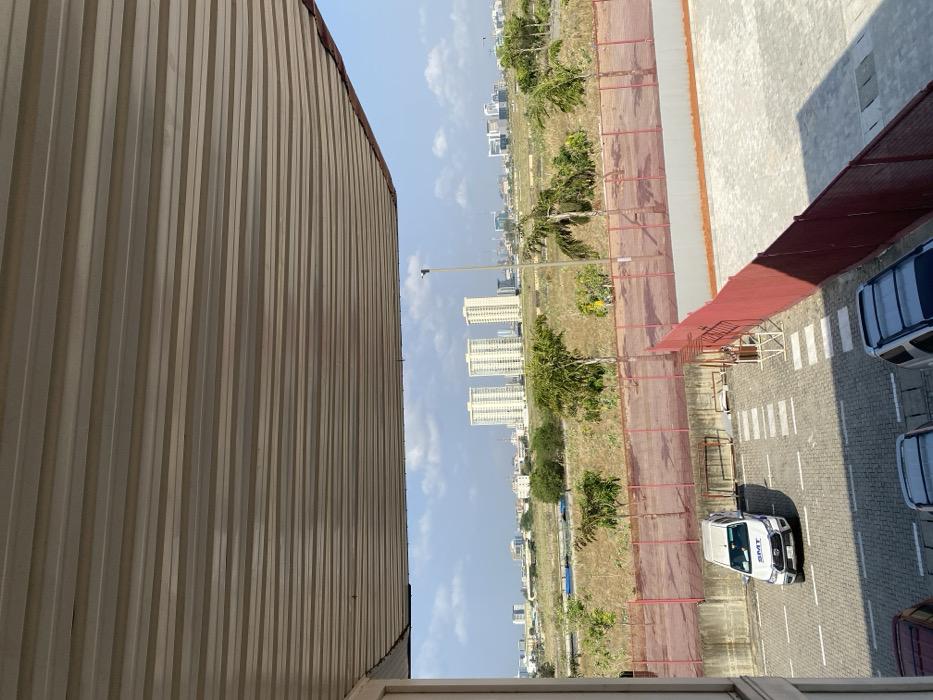 The image depicts an elevated view of an urban-fringe landscape in Inupa Kekere, Nigeria, under a clear daytime sky with scattered white clouds. The perspective is from beneath a light-colored corrugated metal overhang, which occupies the upper portion of the frame. In the foreground, a paved parking area with grey interlocking pavers is visible on the lower left. A white panel van, marked with "SMT" on its side, is parked on these pavers, oriented towards the right. Partially visible vehicles include a dark red vehicle on the far left and two grey vehicles in the bottom center. White pedestrian crossing markings are present on the paved surface. A red metal fence and a low concrete wall separate the parking area from a large expanse of undeveloped land beyond. This land is covered in dry, light brown vegetation and features several scattered trees, including some with green foliage and others resembling palm trees. A tall, dark grey lamppost stands vertically in the mid-right. A large blue structure is partially visible in the mid-ground left. The background reveals a distant cityscape on the horizon. Three prominent, tall, multi-story white buildings with uniform facades are clustered in the center-left. Additional smaller buildings and urban infrastructure extend across the horizon, with industrial or port facilities discernible on the far right. No individuals are visible within the scene.