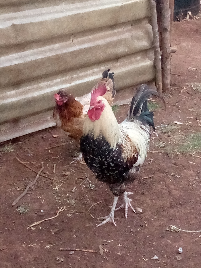 A rooster and a hen are outdoors. The rooster stands prominently in the foreground, exhibiting a vibrant combination of white, black, and brown plumage. Its prominent red comb and wattles are clearly visible. The hen, positioned slightly behind the rooster, displays brown feathers. The background features a corrugated metal structure. The ground is earthy with scattered sticks and sparse greenery.