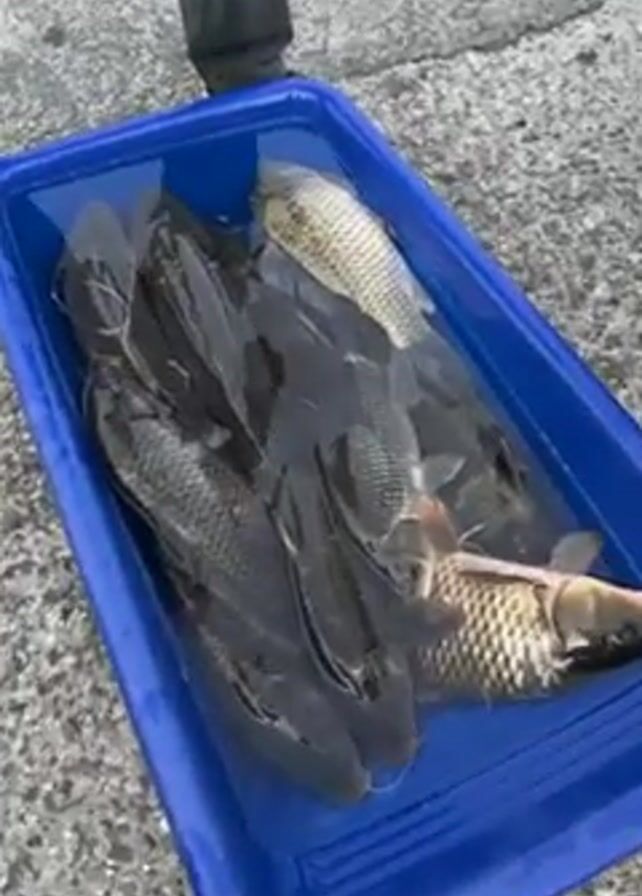 A blue rectangular plastic bin sits on a concrete surface, filled with water and several fish, including what appear to be catfish and carp