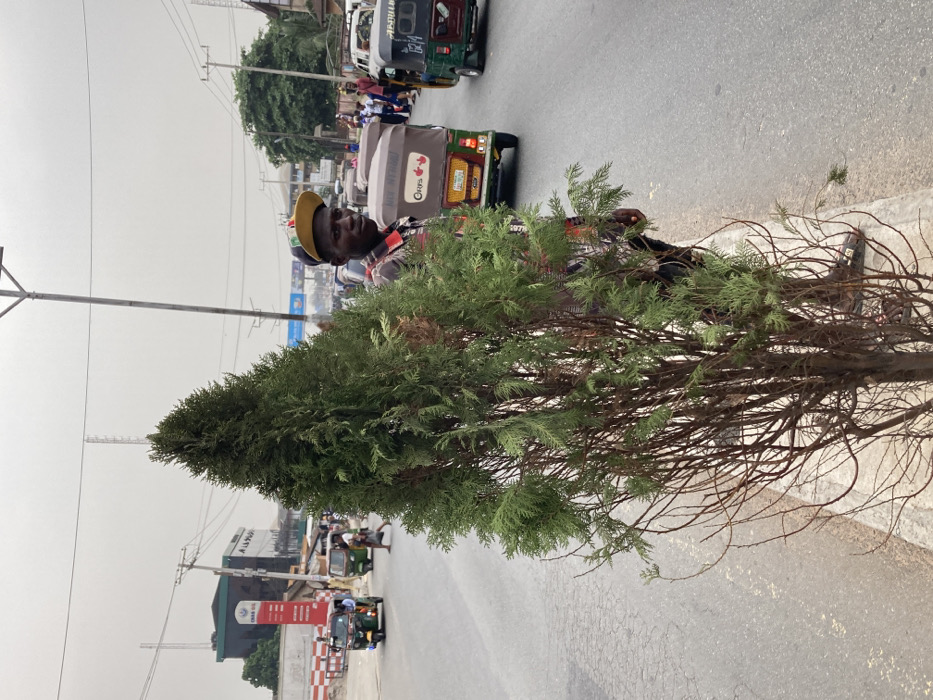 The image depicts an urban street scene in Aba, Abia, Nigeria, under a hazy, overcast sky. In the foreground, a tall, conical evergreen tree with green foliage on its upper section and sparser, brown branches on its lower trunk stands on a light grey concrete median. Partially obscured by the right side of this tree, a Black adult male is visible, facing the camera with a neutral expression. He wears a yellow and black baseball cap reversed, a multi-colored plaid shirt, and dark trousers. A small, dark object is held in his left hand, which is bent at the elbow. To the left of the tree, a cracked asphalt road extends into the background. Multiple auto-rickshaws (Keke Napep) are present on the road, generally oriented away from the camera. Two green auto-rickshaws are on the far left, while a brown auto-rickshaw displaying "ORIS" branding is directly behind the partially obscured man. Another green auto-rickshaw is visible on the far right of the road. In the far left background, a dark building with a prominent red "CHAN OIL" sign is visible, along with multiple utility poles and overhead power lines. On the far right background, a group of pedestrians is discernible on the roadside, with additional vehicles in the distance. A tall, light grey metal utility pole stands vertically in the midground, to the right of the tree.
