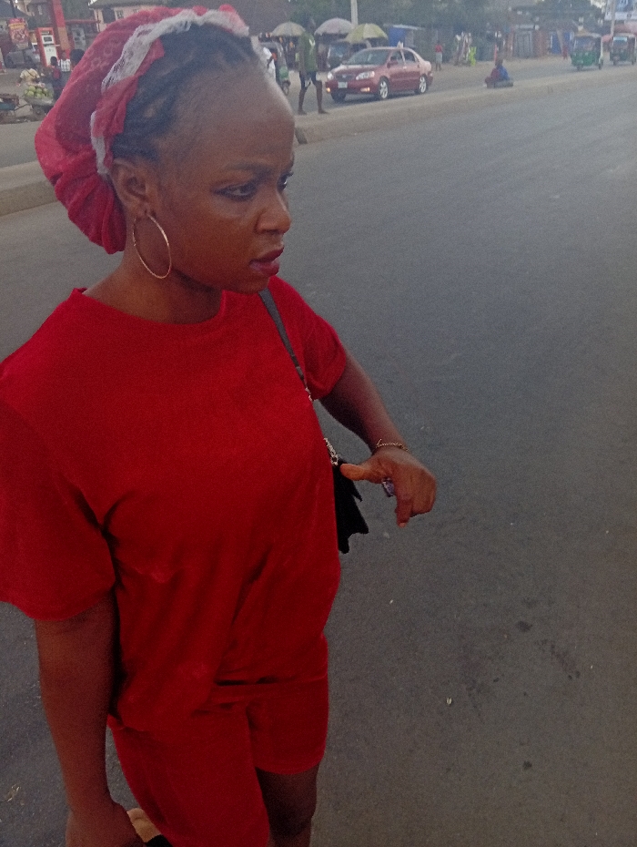 A woman in a red shirt and shorts stands on an asphalt road. She wears a red head covering with white lace. Gold hoop earrings are visible. She has a black purse slung over her shoulder. The background shows a street scene with pedestrians, parked cars, and buildings under an overcast sky.