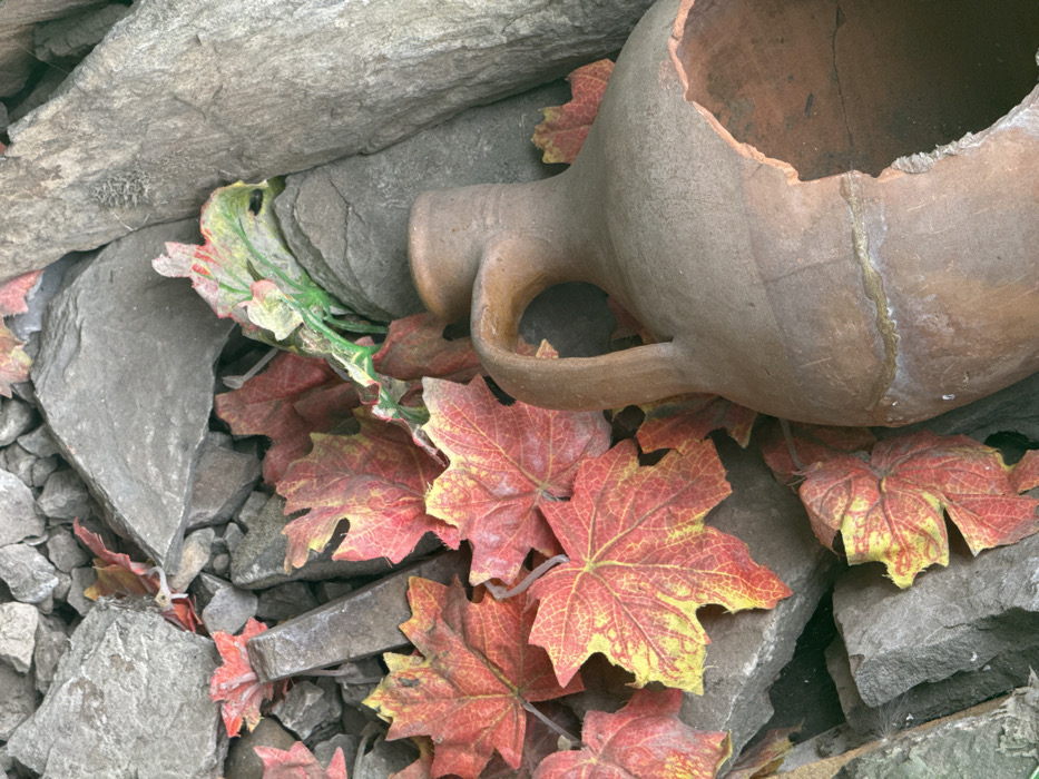 This image presents a close-up, slightly elevated view of a decorative arrangement in Kurganinsk, Russia. The scene features a fragmented terracotta jug positioned in the lower right, exhibiting a large, irregular break along its body on the right side. The jug has a handle and a narrow neck. Scattered across the entire frame are numerous artificial autumn leaves, primarily red and yellow with visible vein patterns, resembling maple foliage. These leaves are interspersed among various grey, irregularly shaped rocks and stones that form the underlying terrain. A strand of artificial green foliage, potentially with small pink floral elements, is partially visible in the upper central-right portion of the image, emerging from behind rocks and leaves. The lighting is even, suggesting an outdoor or well-lit indoor setting.