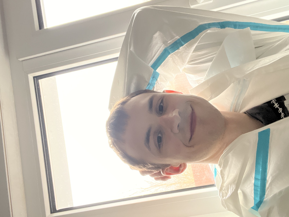 A young adult male, with short brown hair and light skin, is depicted in a close-up indoor selfie in Starokorsunskaya, Russia. He is smiling directly at the camera. He wears a white, disposable-style protective suit with light blue taped seams, over a dark undershirt. His right hand is raised near his head, resting against his temple, with part of the suit's hood visible to his right. The background is dominated by a large, multi-pane window with white frames and dark seals, revealing a brightly overexposed outdoor scene with faint outlines of bare tree branches visible through the left pane.