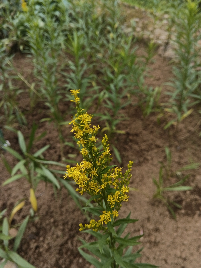 A field of green plants with tall, slender stems and narrow leaves fills the background. The ground is visible between the plants, appearing as reddish-brown soil. In the foreground, a single stem adorned with numerous small, bright yellow flowers stands out. The flowers are clustered densely along the stem, creating a vibrant contrast against the green foliage and earthy background.