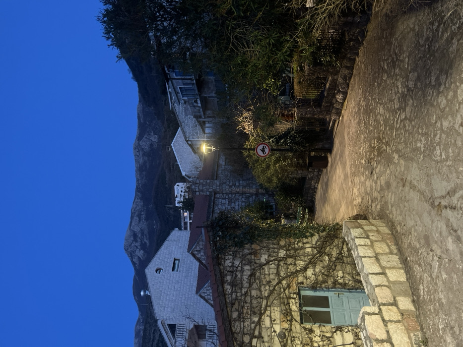 An image of a European mountain village at dusk. A blue sky occupies the left of the frame as mountains rise behind houses with stone exteriors and tile roofs. A cobblestone street runs from the foreground to the middle of the frame. A blue door and a stone fence line the street. A street light illuminates the scene and sits next to a traffic sign with a symbol of two overlapping motorcycles.