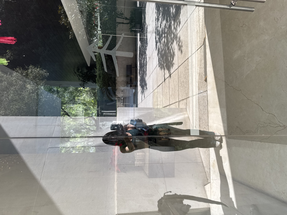 A full-length reflection captured on a glass surface displays a person holding a phone, likely taking the picture