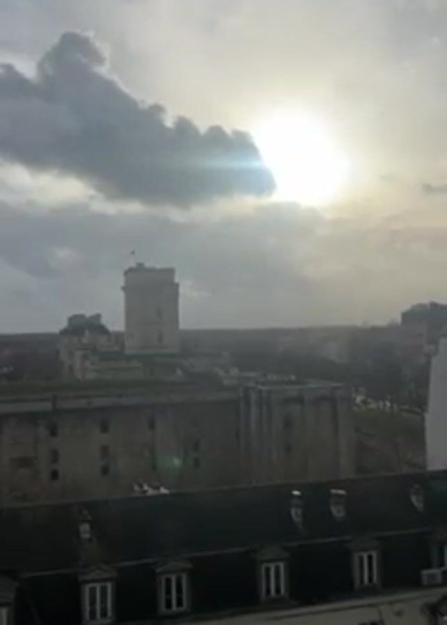 cityscape with a large, fortified building complex and a tall, cylindrical tower in the center. The sky is overcast with clouds, and the sun shines through, creating a bright, hazy effect. The buildings in the foreground have a traditional European architectural style with dormer windows. Trees are visible in the distance, and the overall scene appears to be taken from an elevated viewpoint, possibly a building. The wind is audible.