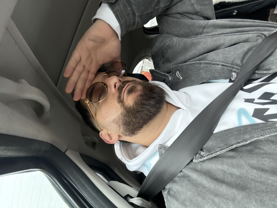 The image displays a male individual seated in the driver's position within a vehicle, with no visual cues in the image to confirm the specific location within Vendenheim, France. The man has a full dark beard, short dark hair with faded sides, and wears round, gold-framed sunglasses with tinted lenses. He is dressed in a white hooded sweatshirt featuring black and light blue graphics, beneath a distressed dark grey jacket. A black seatbelt is fastened across his chest. His right hand is raised and pressed against his forehead, partially obscuring the upper right side of his face. The vehicle's interior features a light-colored headliner and visible overhead grab handles. The external environment visible through the windows is blurry and indistinct, suggesting an overcast or brightly lit sky without specific identifying landmarks.