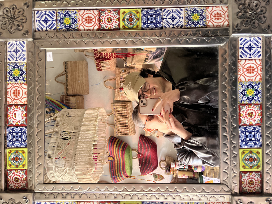A mirror framed with colorful tiles reflects a shop's interior and a couple taking a selfie. Woven bags hang on the wall behind the photographer and subject, displayed neatly. The frame is detailed with metalwork around the tiles. The people in the reflection are smiling, capturing a moment in the shop. The reflection provides a glimpse into their shopping experience, showcasing the store's offerings.