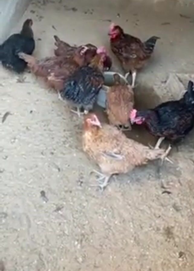 group of about eight chickens gathered around a small bowl in a dirt-floored enclosure. The chickens vary in color, including brown, black, and speckled. Some appear wet. They are pecking at the bowl, presumably eating or drinking. The enclosure has concrete walls and a corner is visible.