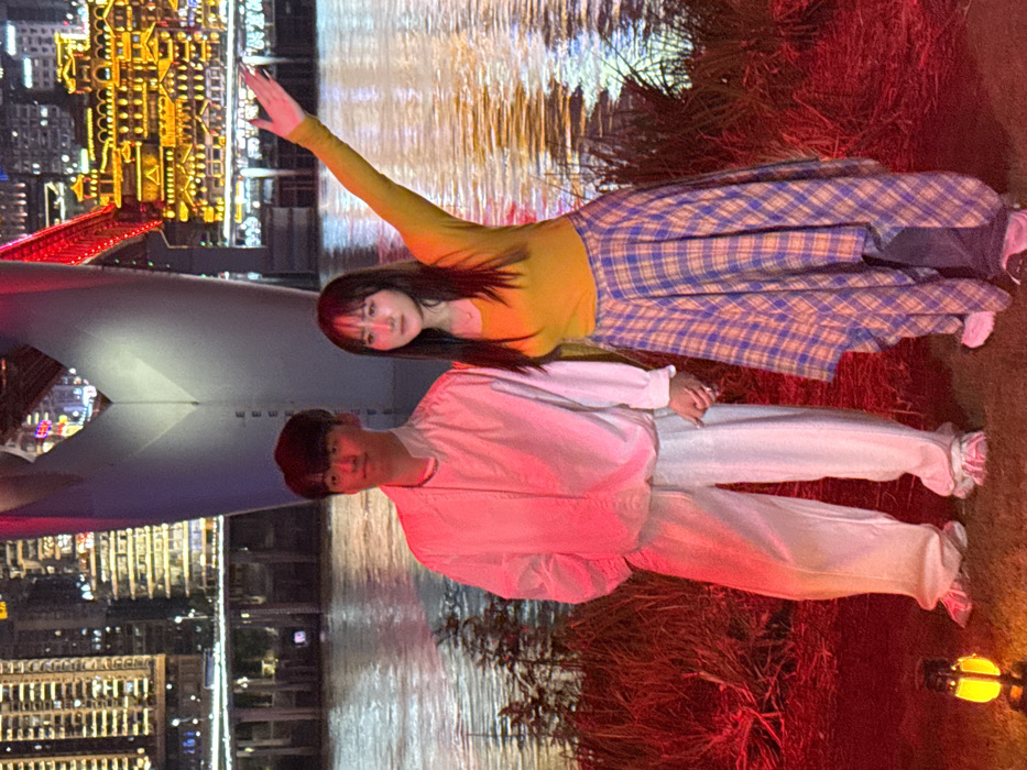 A young couple poses in front of a body of water with illuminated buildings in the background. The man wears a white tracksuit, while the woman has on a yellow long-sleeved top and a plaid skirt. She raises her arm, appearing to wave. A bridge structure is visible behind them. The scene is bathed in an overall red glow, with a lantern-like light illuminating the ground in the lower left corner.