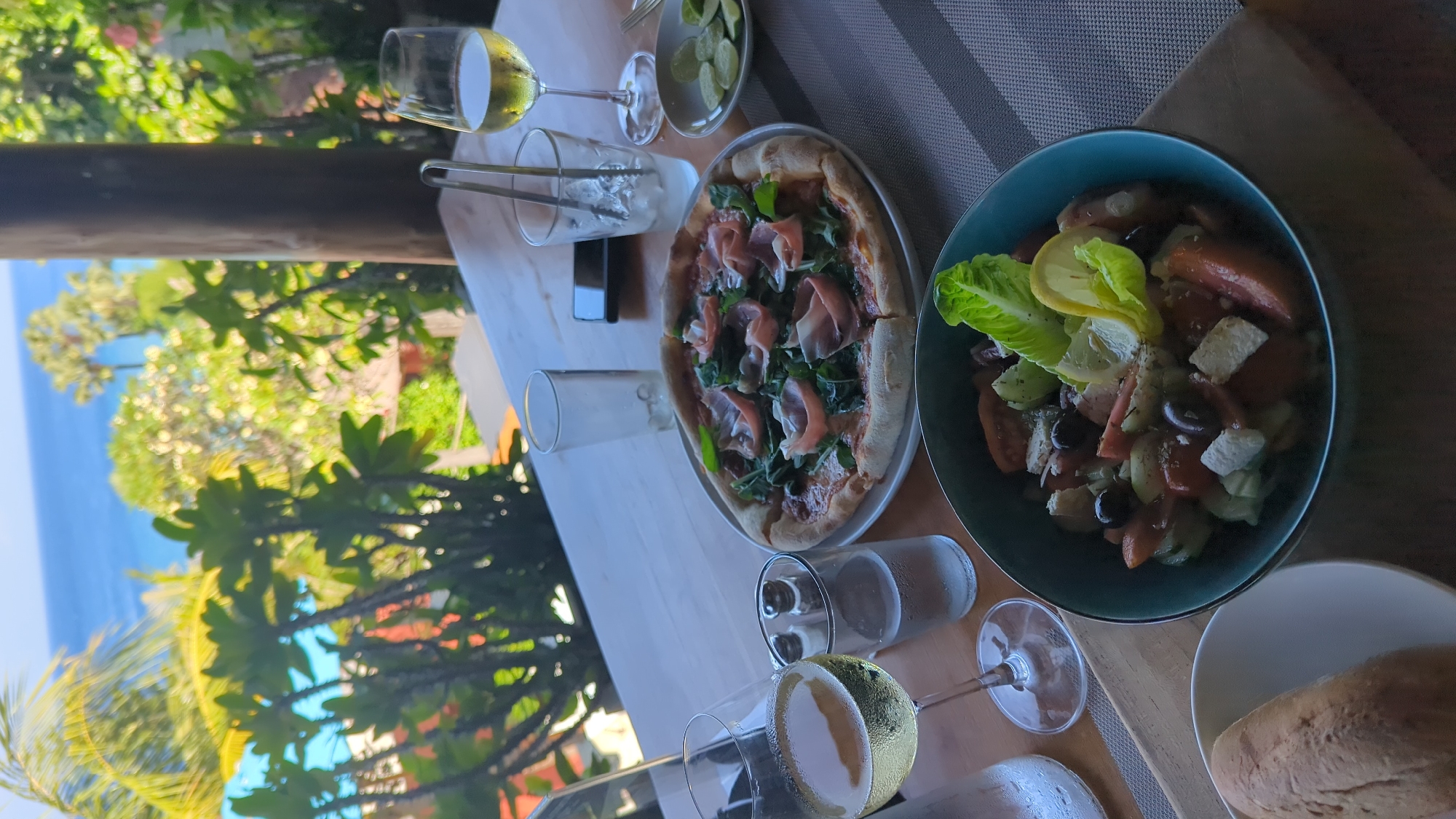 A table is set with a meal that includes pizza, salad, bread, and white wine. The scene is outside with a view of palm trees and the ocean. The location is likely Abang, Indonesia.
