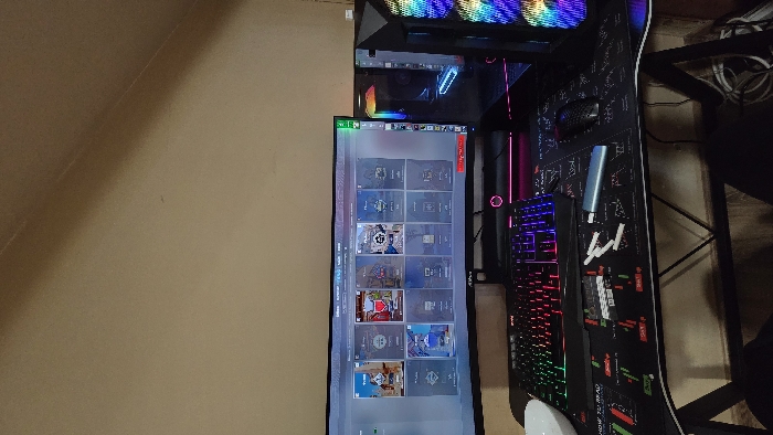 The image presents a computer workstation situated within a room in Kazanlak, Bulgaria. The background features a plain, light brown wall, with a diagonal line in the upper right corner indicating an angled wall or ceiling. A large, widescreen monitor displays a user interface with multiple distinct square panels, each containing an image and text, consistent with map or game mode selections. The monitor's bezel features the "ACER" brand. To the right of the monitor, a black computer tower with a transparent side panel is illuminated by multi-color RGB lighting emanating from its internal components and front panel. A smaller, darker computing device with RGB lighting is positioned directly behind it. The foreground is occupied by a black desk. On its surface, a black gaming keyboard with active multi-color RGB backlighting is centrally located. A white bowl is partially visible to the left of the keyboard. A black desk mat, patterned with green and red bar charts and text, covers the desk. Scattered on this mat, to the right of the keyboard, are several small white cylindrical objects, a small rectangular black object with white text, and a light blue metallic cylindrical device. A black gaming mouse rests further to the right on the mat. The desk structure includes visible black metal frame legs. White electrical cables are loosely gathered on the floor beneath the desk on the right side. No individuals are present in the scene.