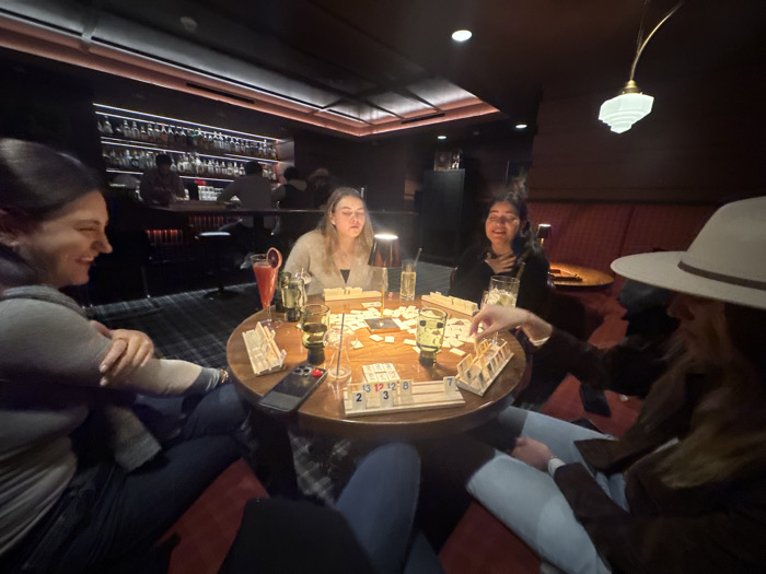 Four women are gathered around a round table, playing a game with numbered tiles. Several drinks are on the table amidst the game pieces. The room is dimly lit, with a bar visible in the background and a unique light fixture hanging above. The women are seated on a red upholstered bench that wraps around the table. A cellphone rests on the table.