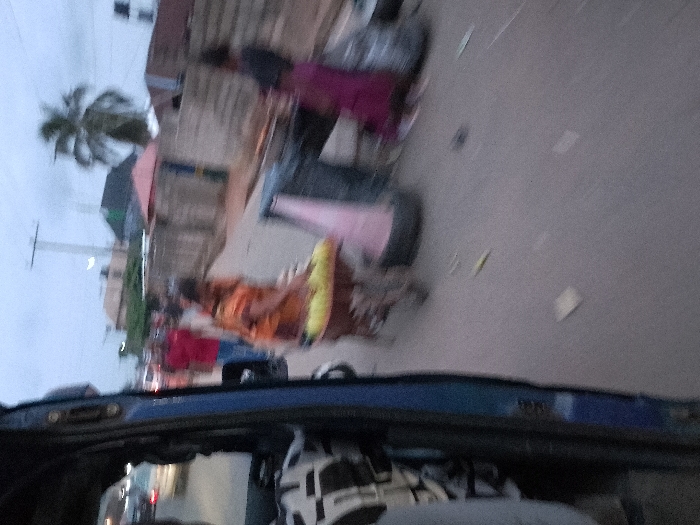 The image depicts a street scene in Orie Uratta, Nigeria, captured from inside a moving vehicle, likely a tricycle (keke napep), indicated by the blue frame and patterned seat visible on the left. The lighting suggests dusk or an overcast day. In the midground, a woman wearing an orange top and a patterned skirt pushes a brown wheelbarrow loaded with multiple light yellow objects, possibly produce such as plantains or corn, from left to right across the paved road. Further right, another individual, partially obscured and blurred, is seen in a dark top and a magenta skirt, positioned near items on the ground that resemble market goods or discarded materials, including a dark-colored tire and other dark objects. In the background, multiple blurry figures of pedestrians and vehicles are visible along the street, suggesting ongoing activity and traffic. Buildings line both sides of the road, including structures with a light-colored fence or wall. A tall utility pole with overhead lines is present, alongside a palm tree on the right side of the street. A small structure with a reddish roof is also discernible in the background. The road surface appears grey and scattered with small pieces of debris.
