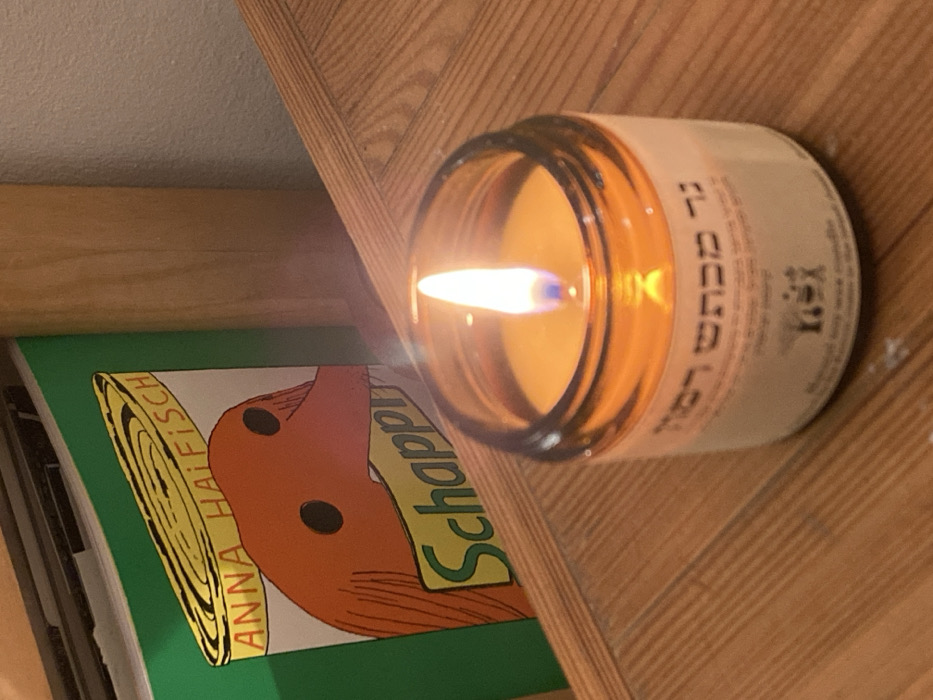A lit candle sits on a wooden surface next to a book. The candle is in a glass jar with a label in a non-English script. The book has a green cover, and an orange illustration of an animal face with black eyes. The illustration is partially obscured by the candle. Text on the book reads "Anna Haifisch" and the word "Schappi" is prominently displayed.