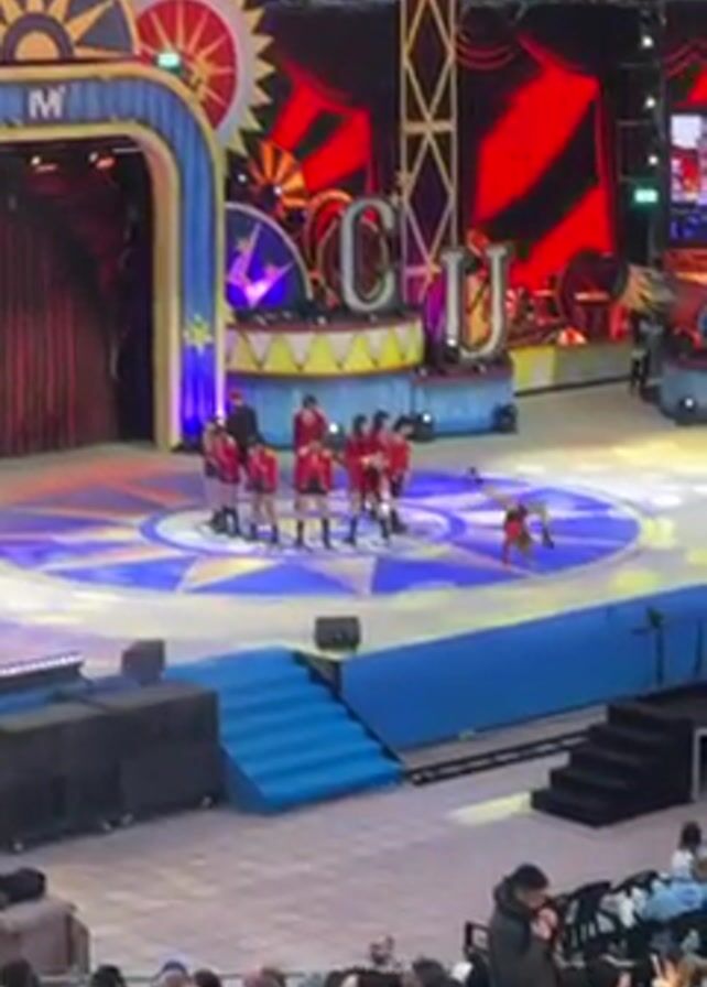 A dance team of nine members is performing on an outdoor stage. The dancers are all wearing red and black outfits. They are performing in unison, with coordinated movements. The stage has a circus theme, with a large, colorful backdrop and decorative elements. The audience is seated in the foreground, watching the performance. The environment appears to be an outdoor entertainment venue.