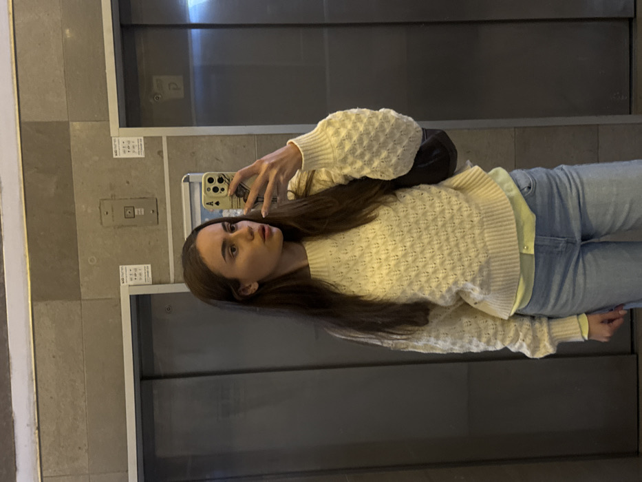 - "A woman in light blue jeans and a cream-colored knit sweater takes a selfie in front of elevator doors" by FM-Q10cY2, licensed under CC BY 4.0
