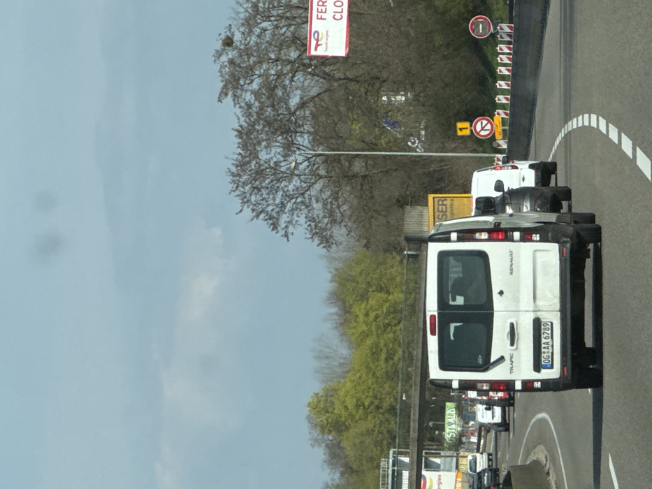 The image depicts a multi-lane highway or motorway in the city of Ostwald, France, under a partly cloudy sky. The perspective is from within a moving or stationary vehicle, looking forward into moderate traffic. In the immediate foreground, a white Renault Trafic van is centered, displaying French license plate "OG AA 6789" on its rear bumper. The van has a rear wiper and vertical taillight assemblies. Directly behind it, a dark grey/black SUV or car is visible, followed by another white van. Further down the road, a line of vehicles, including several white vans and passenger cars, indicates traffic congestion or a queue. To the right of the primary lane, a white solid line delineates the road shoulder. Along this shoulder, a series of red and white striped temporary barrier segments are deployed, preceding various traffic signs. These signs include a circular yellow sign with a black arrow and a red slash (indicating a restriction or change in direction), a red circular sign with a horizontal white bar (likely "No Entry"), and a yellow sign with a black "1" and an arrow, potentially indicating a lane merge or exit. A tall grey lamppost stands near these signs. Beyond the shoulder, deciduous trees with bare branches are visible, suggesting late winter or early spring. A large white sign with the red "te totalenergies" logo is present, displaying partially visible text "FERMER CLO" (likely "FERMÉ CLOS" - closed). To the left of the primary lane, a concrete barrier separates the lanes from an adjacent road or parallel section of the highway, where additional vehicles are visible. Behind this barrier, lush green trees with some bright green new foliage are prominent. An overhead bridge or structure spans across the scene. Two commercial signs are also visible: a large yellow sign with black text reading "SER logistics" and another sign that partially reads "OSTRWALD" (indicating Ostwald) and the "Totalenergies" logo. The sky is light blue with scattered white clouds. Two dark, indistinct smudges are visible near the top center of the frame, consistent with lens artifacts. No individual people are distinctly visible, but drivers are implied within the numerous vehicles.