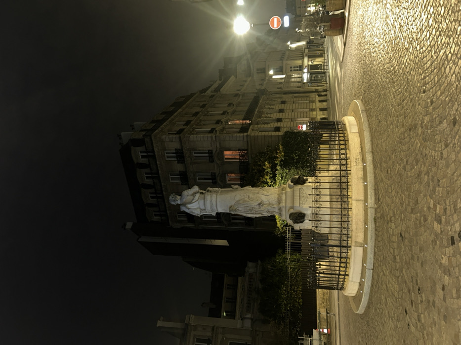 At night, a statue stands encircled by a black iron fence on a circular base. The surrounding cobblestone street glistens under dim streetlights. Behind the statue rises a tall building with multiple floors and lit windows. The sky is a dark, muted expanse. A no entry road sign is visible on the right, contributing to the urban ambiance.