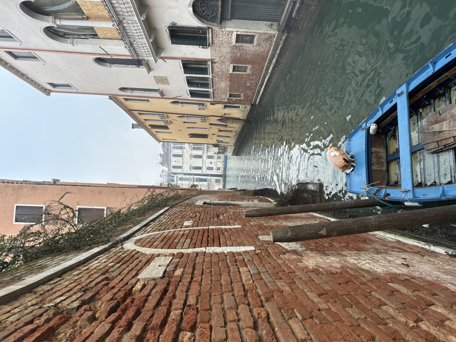 This image depicts a narrow canal in Venice, Italy, under an overcast sky. The view is angled slightly downwards into the canal. On the left, a weathered brick wall with reddish-brown bricks and some white mortar lines extends from the foreground into the midground, bordering the canal. Green vine-like vegetation grows along the top edge of this wall. Two wooden mooring posts (briccole) are partially submerged in the water, secured next to the brick wall. A blue wooden boat is moored in the foreground, parallel to the brick wall and the wooden posts. The boat appears worn, with visible wooden planks on its interior, some loose wooden pieces, and a white buoy tied to its side. On the stern of this boat, a small, light orange object, resembling a dog wearing a sweater or a stuffed animal, is positioned, facing away from the camera towards the distant canal. On the right side of the canal, a multi-story building with a light cream-colored facade features arched windows, dark shutters (some closed, some partially open), and a decorative white balcony. One upper-story window on this building is boarded up with plywood. Further down the canal, another multi-story building with a yellow facade is visible, also bordering the water. The canal water is a murky green color, showing ripples and reflections of the surrounding buildings and the sky. In the distant background, more traditional Venetian buildings, some lighter in color, are visible under the uniform grey sky, and a small blue boat can be seen further down the canal. No human figures are present in the scene.