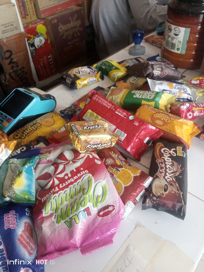 The image displays an indoor retail scene, likely a small shop or counter, filled with an assortment of packaged snack foods on a white surface
