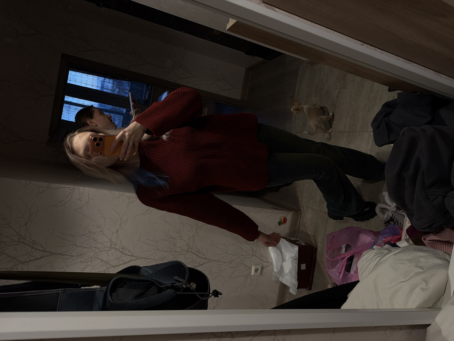 An indoor residential scene in Khimki, Russia, is depicted through a full-length mirror reflection. A primary subject, appearing female, with long, light-colored hair accented by blue streaks, stands centrally, taking a selfie with an orange-cased smartphone that obscures her face. She wears a dark red ribbed sweater, dark jeans, and black lug-soled shoes. To her left, a dark bag hangs on a wall with light, tree-patterned wallpaper. On the floor nearby are a brown box containing white tissue paper, a pink plastic bag, and a collection of clothing items and a white duvet. A small, light-furred dog stands on the tiled floor to the primary subject's right, facing towards the reflection of a doorway. Beyond this doorway, a secondary individual, with dark hair, is partially visible, holding a white rectangular object while looking out a window. The windowpane exhibits streaks, possibly from rain or condensation, and reveals a dim outdoor view of structures under a low-light sky. The flooring is a light-toned tile. The overall lighting is dim.