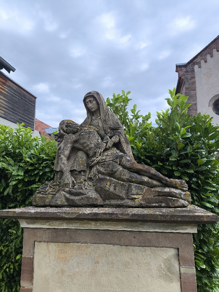 - "A weathered stone sculpture depicting a Pietà is prominently featured in the foreground" by FM-NIq6z1, licensed under CC BY 4.0