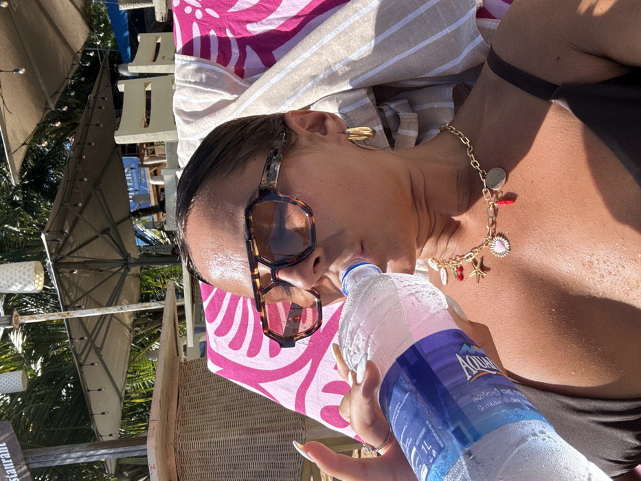The image captures a female individual from the chest up, positioned in a sunny outdoor setting in Rumassala, Sri Lanka. The subject, a woman with dark hair pulled back, exhibits moist, tan skin consistent with perspiration. She wears large, hexagonal, tortoiseshell-patterned sunglasses and gold-toned hoop earrings. Around her neck is a gold-colored link chain necklace adorned with multiple charms, including a starfish, a pink heart, a red chili-shaped pendant, and a circular medallion. She is wearing a black bikini top. The woman is actively drinking from a clear 1-liter plastic water bottle, labeled "Aqua" with additional text in Sinhala, held by her right hand to her mouth. Her left hand, partially visible, has manicured nails and a ring on the ring finger. She is reclining on a surface covered by a pink and white patterned towel. The background reveals a resort or beach-side environment with beige-colored outdoor seating, large grey-green beach umbrellas featuring string lights, and dense palm foliage. Partial signage is visible, including a wooden sign reading "rant" (likely "Restaurant") on the left and another sign with text resembling "DIVERS" in the center-right.
