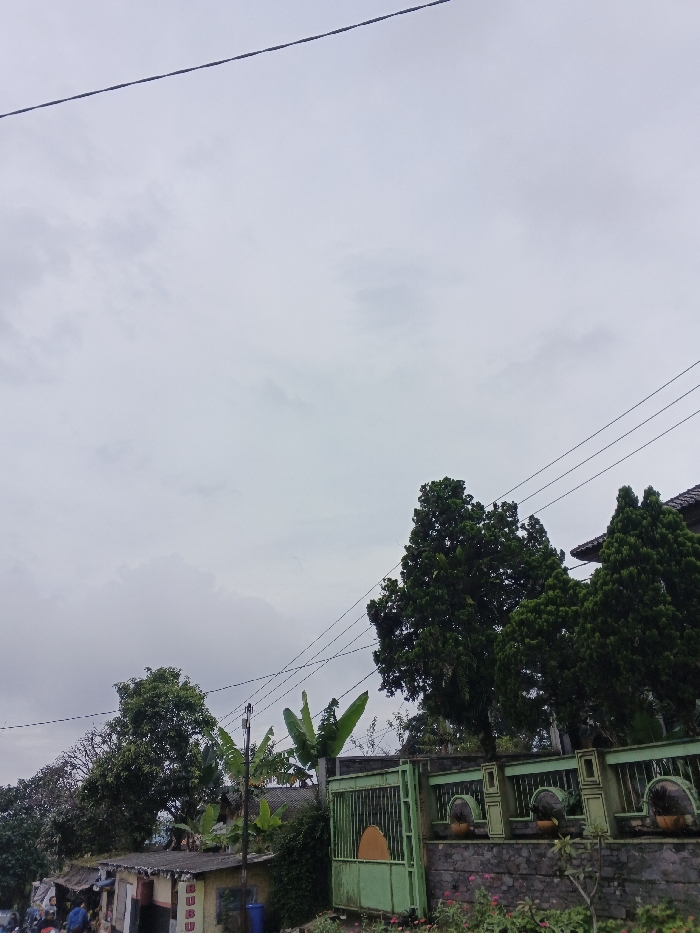 An outdoor scene depicts a residential area in Шчыткавіцкі сельскі Савет, Belarus, under an overcast sky. Approximately 60% of the upper frame is a uniformly light grey, cloud-covered sky, traversed by thin, dark utility lines. In the mid-ground, a light green metal gate with vertical bars and a yellow-orange semi-circular detail is visible on the right. To its right, a low, textured dark grey stone wall features multiple light-colored arch-shaped niches, each containing a dark, round object, possibly a potted plant. Behind the wall and gate, two tall, dark green coniferous trees are prominent, their canopies reaching towards the top right. A dark-tiled roof peak is partially visible behind these trees on the far right. Multiple black utility wires extend horizontally and diagonally across the mid-sky. Towards the lower left and center, a wooden utility pole supports attached wires. Behind it, several large banana plants with broad, vibrant green leaves are present. Further left, a dense deciduous tree with green foliage is visible. In the lower left quadrant, a low, single-story building with a light-colored facade and a dark, flat roof is partially observed. Red lettering, spelling "BUBU," is visible on its side. Immediately in front of this building, several indistinct human figures are gathered. A blue cylindrical container, possibly a bin, rests on the ground near the building. The immediate foreground features overgrown vegetation, including bushes and small pink-flowering plants. No specific actions or interactions are clearly discernible.