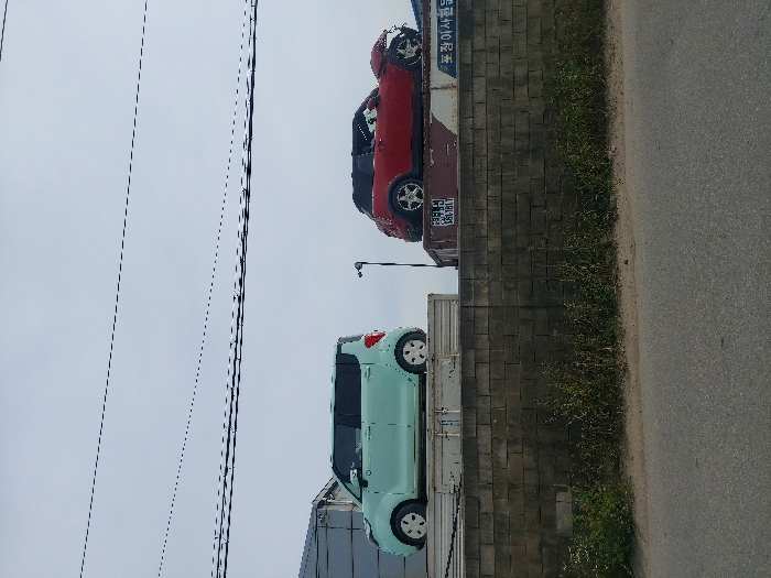 This image depicts an outdoor scene in Gimpo-si, South Korea, under an overcast sky. Two damaged vehicles are prominently displayed, elevated on industrial containers or truck beds, positioned behind a low concrete block wall. On the left, a light blue or mint green tall hatchback vehicle, consistent with a second-generation Toyota bB or similar model, rests on a white, flat-top industrial container or truck bed. This vehicle appears largely intact but its underside is not visible. On the right, a red Mini Cooper convertible, likely an R52 or R57 generation, is positioned atop a dark brown and white shipping container. This Mini Cooper exhibits significant structural damage, with deformation visible on its front and rear body panels. The shipping container supporting it displays Korean text "포장 이사화물" (Packaging Moving Cargo) and the alphanumeric identifier "BSLU 1817." A dark, slender pole, possibly a street light or utility pole, stands between the two elevated vehicles. In the foreground, a dark gray asphalt road surface occupies the lower portion of the frame. This road is bordered by a retaining wall constructed from large, dark gray concrete blocks. Sparse green vegetation, consisting of grasses and small plants, grows along the base of this wall. Multiple black utility lines are visible stretching horizontally across the upper part of the frame against the pale, uniform sky. No individuals are present in the scene, and no overt actions or interactions are depicted.