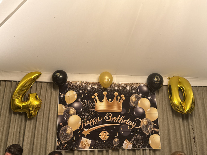 A 40th birthday celebration is evident with a black and gold banner featuring a crown, balloons, and gift illustrations