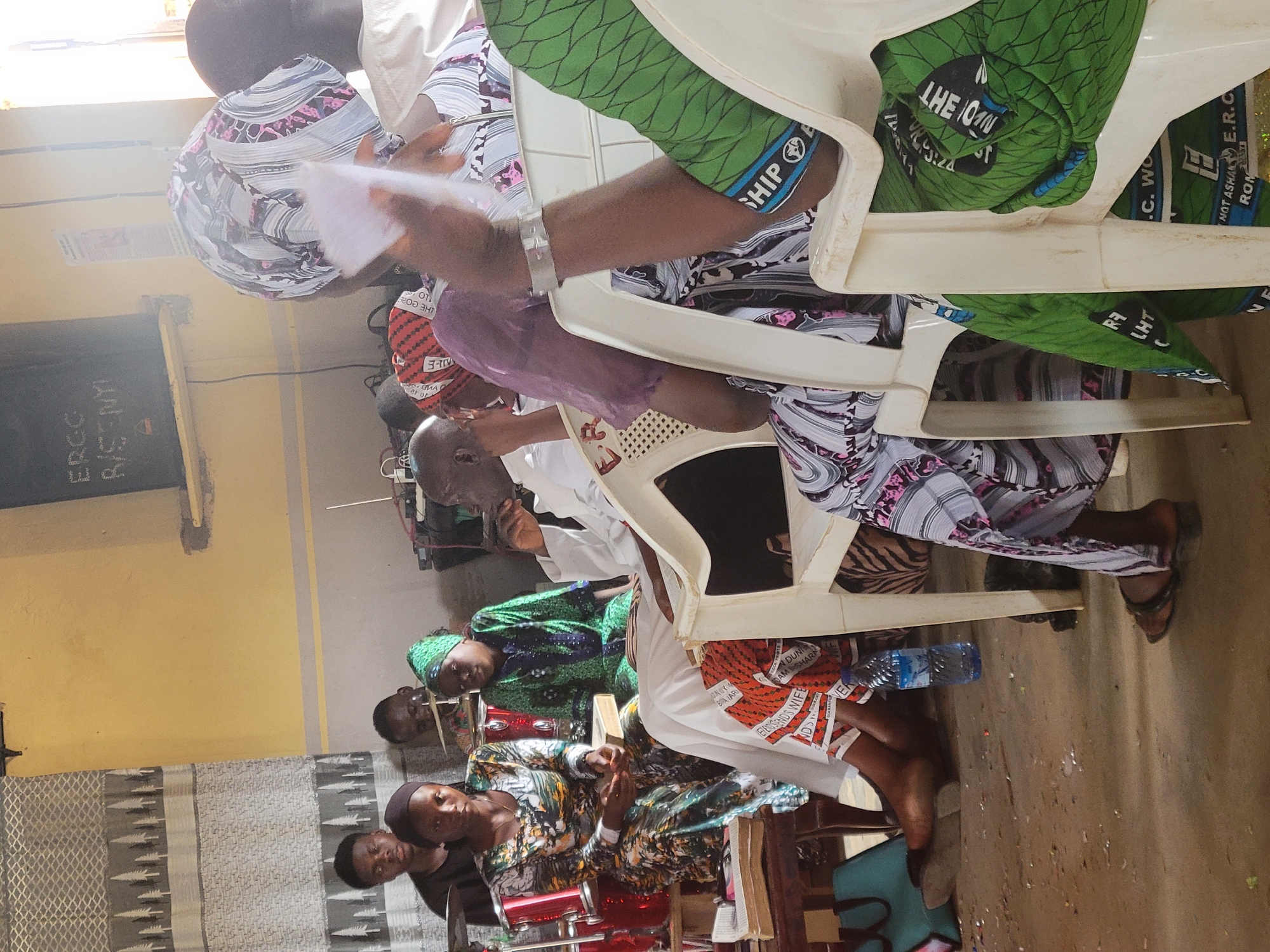 gathering of individuals in what appears to be an indoor meeting or seminar. They are seated on plastic chairs, with some holding papers. A sign on the wall reads "ERGC RISENY". Clothing patterns are diverse and include patterned fabrics. One person has a bottle of water at their feet. There is also text on the fabric, including "THE COOP", "DAM SHARA", "DUNI", "ROM". The location is indicated to be Kwamba, Nigeria.