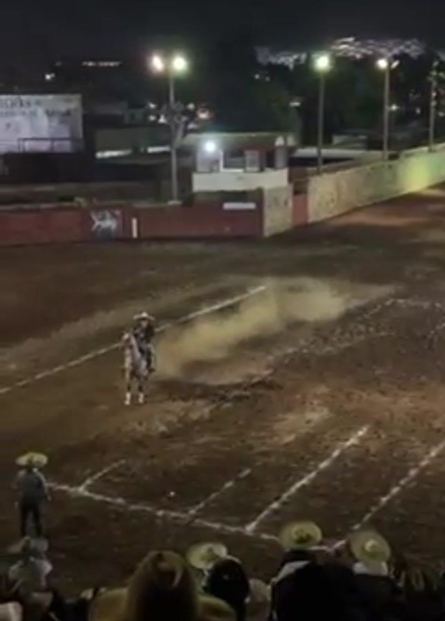 charro riding a horse in a charreada ring at night