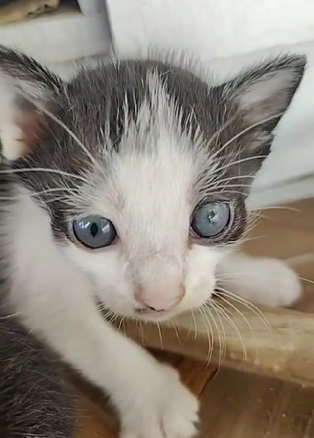 A close-up video shows a kitten with a white face and gray and white fur on its head and body. The kitten has large, blue eyes and is lying down, looking toward the floor. A wooden surface is beneath the kitten, and the background includes a piece of cardboard and a white wall.