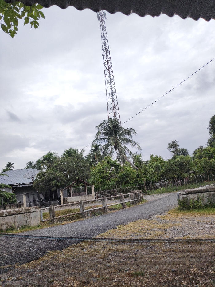 A rural scene in Jurong Pante, Indonesia, is depicted under an overcast, grey sky. A tall, lattice-structured cellular tower dominates the central background, partially obscured at its base by a large, leaning coconut palm tree. To the left, a single-story residence with a grey corrugated metal roof and a satellite dish is visible behind a dark metal gate. Adjacent to the residence stands a small, open-sided wooden structure with a dark roof. A gravel-covered road, bordered by dense green vegetation and various trees, enters the frame from the right, curving left to cross a low concrete bridge with simple, square-section railings. The immediate foreground features a dark, coarse mesh or netting covering a patch of ground composed of sparse grass and dirt. No human or animal figures are present.