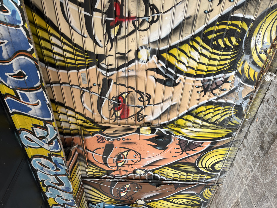 The scene depicts a street-level view of a commercial building in Paris, France, identifiable by cobblestone paving. The entire facade consists of corrugated metal roller shutters, fully covered in multi-layered graffiti. The uppermost section of the shutters displays large blue and white bubble-letter text on a yellow background, partially spelling "FORCE & LO...". Below this, a continuous mural features several stylized female faces rendered in a graphic, illustrative style. From left to right, visible faces include one with dark brown skin, prominent dark eyes, and yellow hair; a central face with a peach skin tone, large orange eyes, elaborate black facial markings resembling piercings or tattoos, and yellow hair; and a partial rightmost face with a lighter skin tone, distinct red-accented eyes, similar black facial markings, and yellow hair. The color palette prominently uses yellow for hair, various skin tones, black for outlines and details, and occasional red and white accents. Small white rectangular stickers with black or blue text are affixed to the shutters over the graffiti. Handwritten black script is visible in multiple areas, including "the bon" near the rightmost face. The lower section of the shutters features a rusted metal kickplate. The foreground shows a cobblestone pavement, appearing damp in areas. No individuals or active subjects are present in the image.