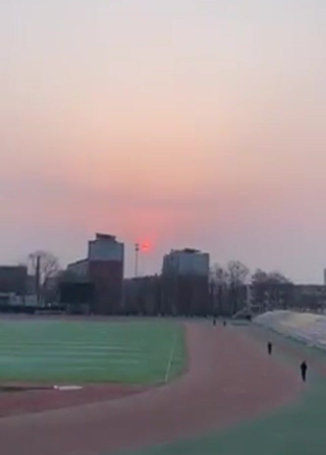 sunrise over a track and field. The sky is a pale pink, and the sun appears as a red circle behind two buildings. The track is red and has a green field in the center. There are a few people walking on the track. The scene is viewed from behind a black metal fence.