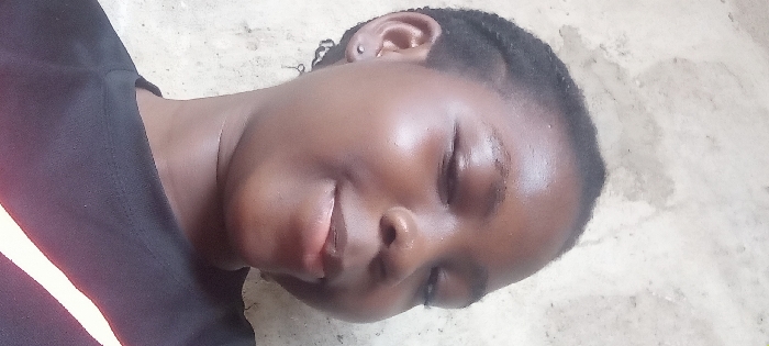 A young Black woman lies on a concrete surface, her head resting at an angle. She wears a dark-colored garment with a white stripe on the left. Her eyes are closed, and she has a slight smile. Her hair is short and styled close to her head, revealing an earring on her left ear. The skin on her face and neck is smooth and reflects light. The background features a rough, textured surface, likely concrete or plaster.