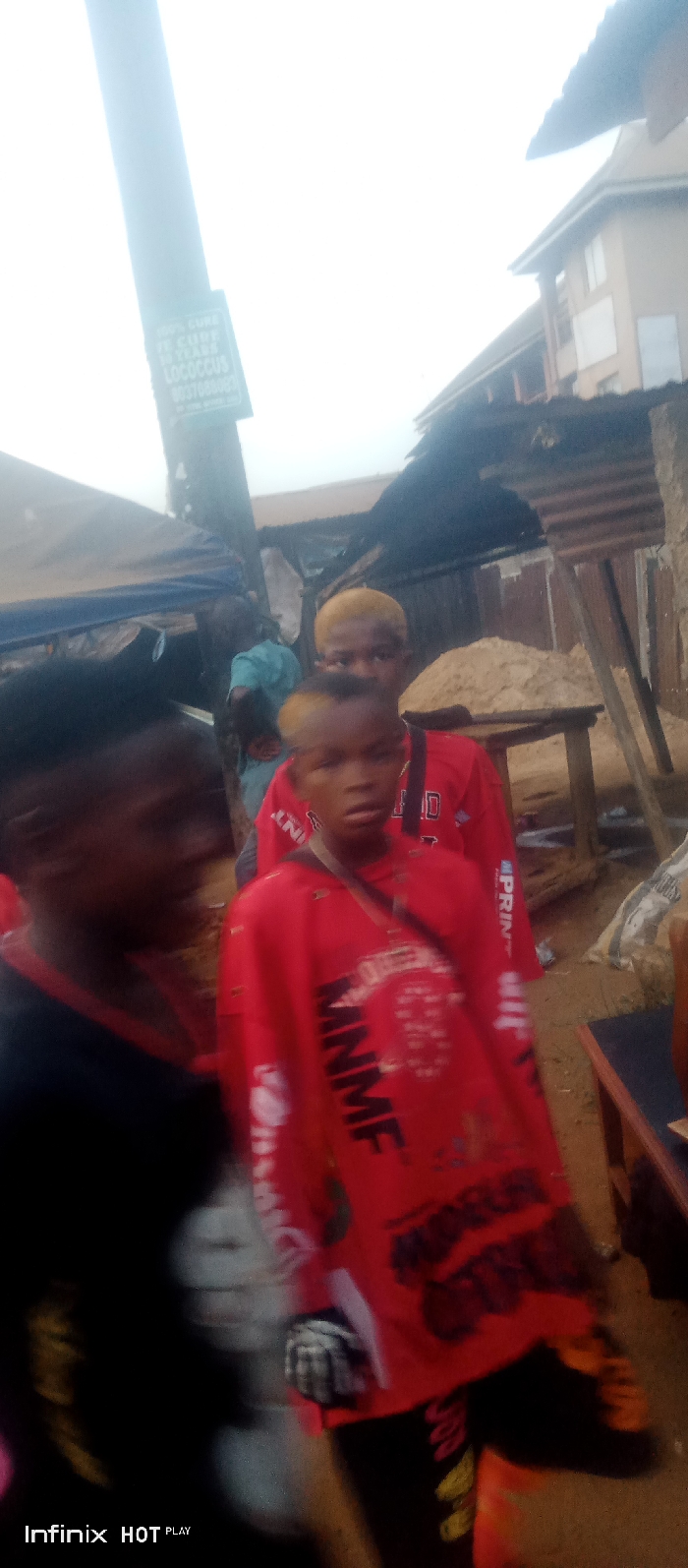 A blurry, candid shot captures a street scene with several individuals. Two boys in red shirts with bold lettering stand out, their expressions neutral. One has dyed blonde hair. A third figure in a dark shirt is partially visible. In the background, there's a makeshift market or roadside business with a mound of sand, metal sheets, and wooden structures. A utility pole with a small sign is also visible. The overall impression is of a bustling, informal urban setting.