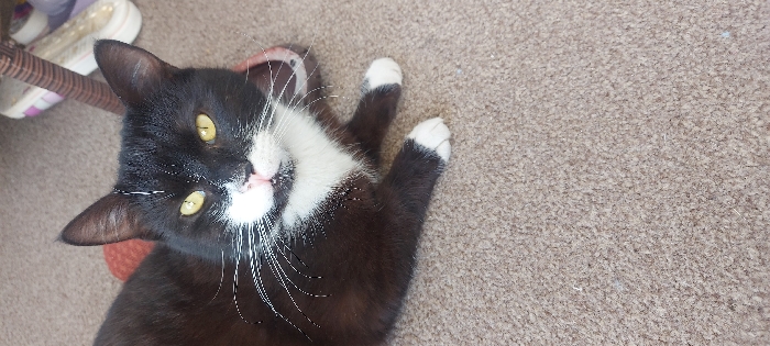 - "An indoor scene depicts a domestic cat lying on a light brown, textured carpet" by FM-KpKSC3, licensed under CC BY 4.0