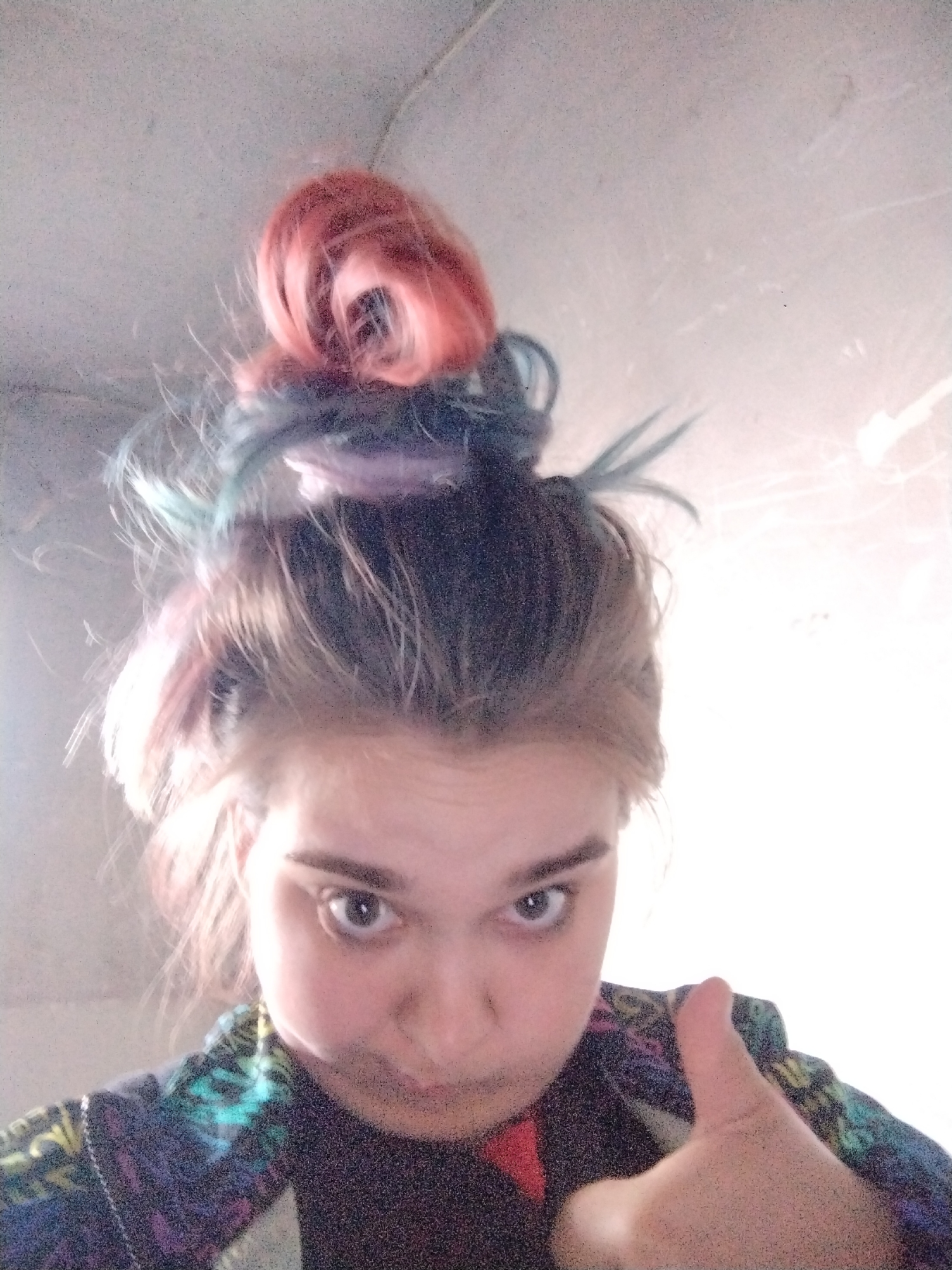 A selfie shows a person with a bun of red and blue-streaked hair, giving a thumbs-up. The person has fair skin, dark eyebrows, and a nose ring. They wear a dark shirt and a patterned jacket with green, purple, and black. The background is a plain, light-colored wall or ceiling. The lighting is bright, slightly overexposed.