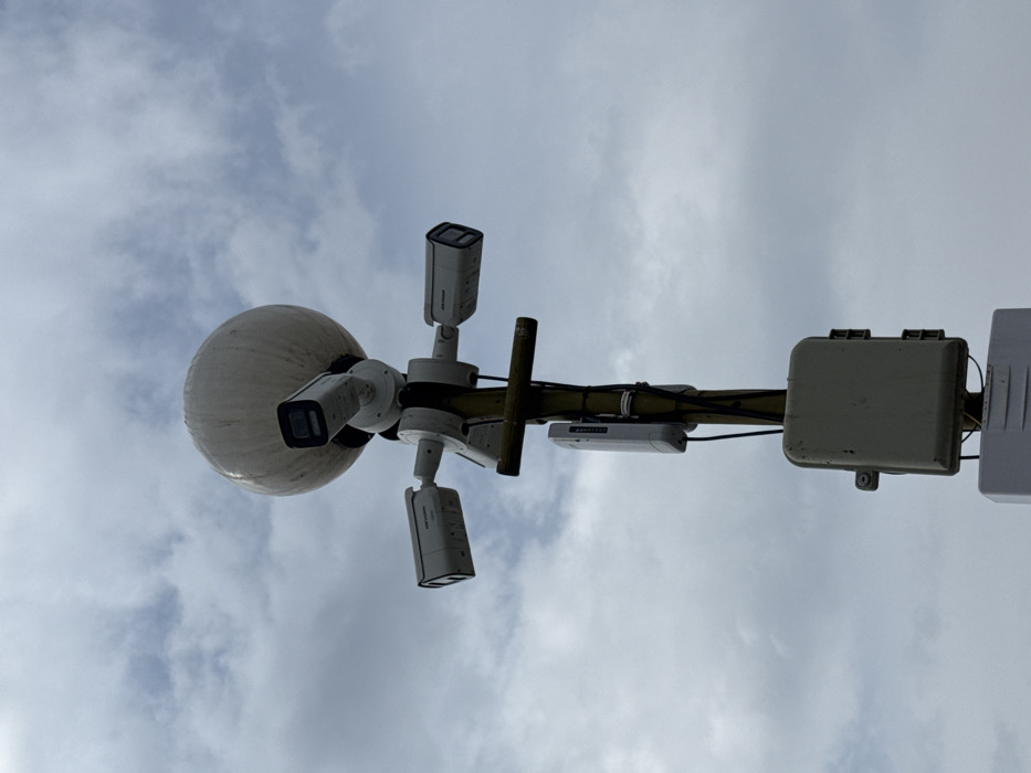 An image depicts a multi-component surveillance system mounted on a pole against an overcast sky in Panicherevo, Bulgaria