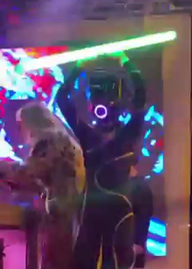 A person in a dark costume with neon accents holds a blue lightsaber above their head, then switches to a green lightsaber. They are on a stage next to someone operating DJ equipment. Behind them is a large LED screen flashing various colors. People are gathered around the stage.