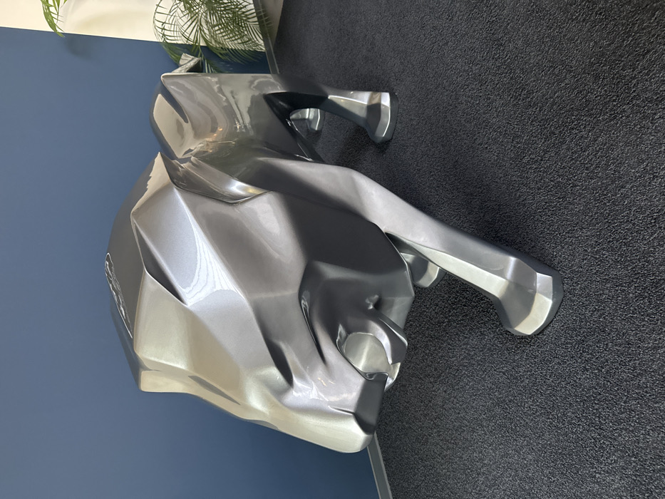 The image displays a large, stylized, geometric sculpture of a predatory feline, rendered in a reflective silver-grey metallic finish